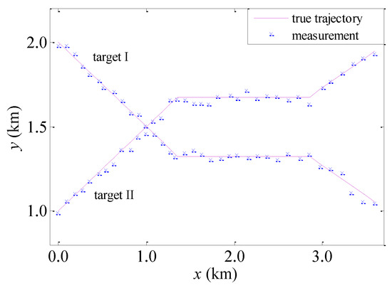 In the simulation scenario, there are two crossing targets moving in the air surveillance of a 2-D Cartesian xy-plane according to the given trajectories, as shown in Figure 6. Their initial states are given as and . The motion processes of the two targets are further divided into five periods, as shown in Table 1. Here, the turn model of a moving target is approximately described by