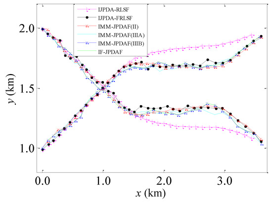 With respect to Figure 7, all estimated filters achieve the correct association results despite the two targets crossing, but they achieve different performance in tracking accuracy. Obviously, IF-JPDAF and IJPDA-RLSF perform well in the CV periods but perform poorly in the CA periods because they utilize the Kalman filter (KF) or RLSF, and these generally perform well for the CV model and are unsuitable for maneuvering motion. Because the tracking performances of these two filters are poor for maneuvering motion, we don’t further analyze their performance below. Similarly, the three versions of IMM-JPDAFs can also obtain a good tracking performance in the CV period.