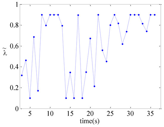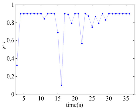 Figure 8 and Figure 9 belong to one of the Monte Carlo cases of the estimates of the fading factors. As for Figure 8 and Figure 9, the fading factor can reflect the changes of the maneuvering characteristics for the two targets correctly. The stronger the target maneuver, the smaller the fading factor. This is consistent with the target maneuvering motion. Hence, employing the fading factor to adjust the proposed filter is an effective strategy.