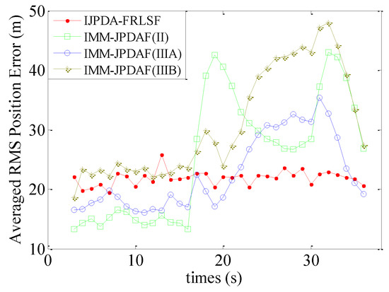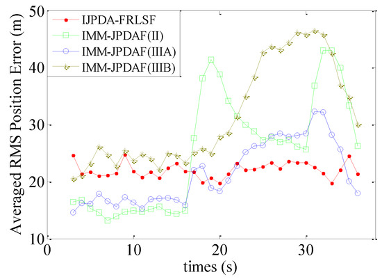We further analyze the performance of each evaluated filter for different dynamic models. According to Table 2 and Table 3, IMM-JPDAF(II) performs better than IMM-JPADF(IIIA) and IMM-JPDAF(IIIB) in the first CV period because it employs less, but better-matched dynamic models. IMM-JPDAF(IIB) obtains the worst results because it utilizes mismatched dynamic models and a measurement noise covariance. This fact shows that employing the matched dynamic models and a measurement noise covariance directly affects the performance of the three versions of IMM-JPDAFs directly. In the second CV period, the order of the performance of IMM-JPDAs only has a little change because their performance is also influenced by the initial state estimates in this period, which are assumed to be equal as the first CV period. Hence, their performance in the second CV period is similar to the performance in the first CV period. Compared with IMM-JPDAF(II) and IMM-JPDAF(IIIA), IJPDA-FRLSF is suboptimal in the CV period. However, it doesn’t need to satisfy the strict assumption of the measurement noise covariance and dynamic models. Additionally, it is also hard to keep the assumption consistent with the real measurement noise covariance and dynamic models in practice.