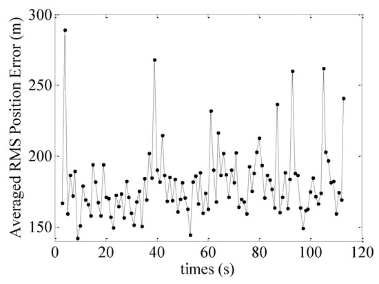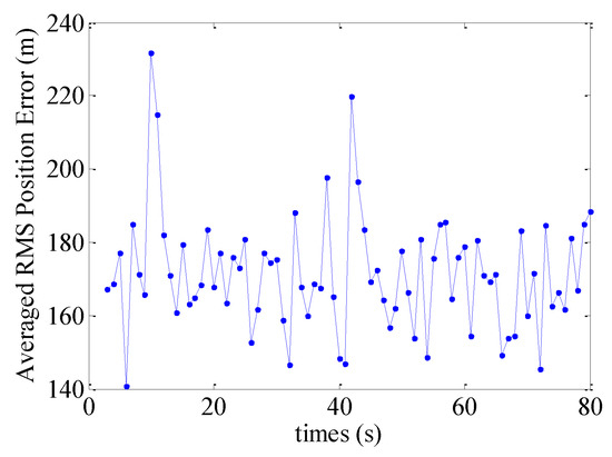 Because the dynamic models of the three targets in the real scenario are unknown and complex, it is difficult to design their matched sub-models. For simplicity to illustrate the feasibility, the tracking results of IMM-JPDAF are unsatisfactory and even diverged so we only utilize the proposed filter for MMTT here. Figure 13, Figure 14 and Figure 15 show the average RMS position error of the proposed filter for the three targets on 50 Monte Carlo runs. According to the tracking results, the proposed filter can track MMT accurately in a real life situation with unknown measurement noise covariances and target dynamic models. Hence, we can conclude that the proposed filter is feasible in a real MMTT applications.