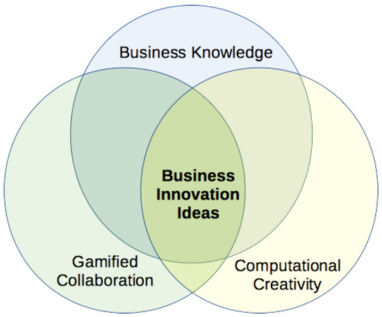 We follow the perspective of the collective intelligence of ideas. Collective intelligence is defined by analogy with individual intelligence, as the general ability of the group to perform a wide variety of tasks [29]. In particular, we use the view showing that collective intelligence originates from data/information/knowledge, hardware/software, and groups of experts. We specialized this view as in Figure 1 to represent that, in our proposal, business innovation ideas require business knowledge, computational creativity, and gamified collaboration. These are the main ingredients to foster business innovation.