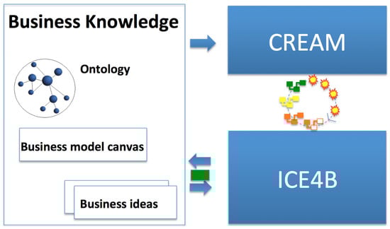 The proposed methodology is supported by software tools, used to enhance both human participation in a business innovation session and the creative activity itself. Indeed, the aim of the methodology is to design novel business ideas for innovation in the form of business model instances. This is accomplished by leveraging business knowledge available both as explicit knowledge, formalized through an ontology, and as implicit and tacit knowledge from humans taking part in innovation teams. An innovation team includes stakeholders and domain experts to provide business knowledge concerning the specific application, as well as knowledge engineers to support the elicitation, collection, and formalization of that knowledge. Thus, formal explicit knowledge is the grounding upon which intelligent tools facilitate the design of new promising business ideas, by automatically supplying conceptual models for such ideas, which we named “creative sparks”. In turn, based on creative sparks, the innovation team’s experience and creativity may contribute to further enrichment of the business knowledge. The collaborative work required by the innovation team about reasoning on creative sparks is enhanced through gamification of the creative process. Game elements such as rewards based on contributions allow the expansion of peoples’ engagement. Game mechanics settings such as play roles (e.g., facilitator, actor to provide different views), and idea structure based on patterns and rules allow the creative process to be conducted towards successful ideas for innovation.