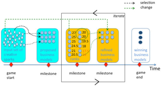 The gamified collaboration process is depicted schematically in Figure 5. This represents the main steps of the process. First, some creative sparks are generated by CREAM and selected by the coordinator as a basis for business models to be considered by the other participants. At this point, each participant can select a creative spark and build a business model upon it, by providing an interpretation of the conceptual model and a textual description. Of course, a participant can create more than one business model. Authors of business models take the role of proposer. A milestone is defined by the coordinator for collecting the first set of business model proposals. Then, all of these proposals are made public and voted by all the participants of the game. At the second milestone, the ranking of the proposals is revealed. At this point, the participants are invited to try to improve the proposed business models. They may do this by exploiting the CREAM heuristics-based functions described in Section 4.2, such as combination, transformation, and analogy-based search functions. Any participant who elaborates upon a business model proposal either individually or collaboratively will take the role of contributor. Of course, low-scored business model proposals are less likely to be selected for improvement, but it may still be possible for other participants, or the proposer herself, to re-think those ideas and to transform them in successful business models. All the updated business model proposals are then voted on again. Those with low score that have not been improved will be discarded in the subsequent iterations of the last two phases. The game will end either when a small number of business process models (e.g., three) have been recognized as the best (i.e., by convergence); when a previously decided time end is reached; or if the coordinator decides to stop it.