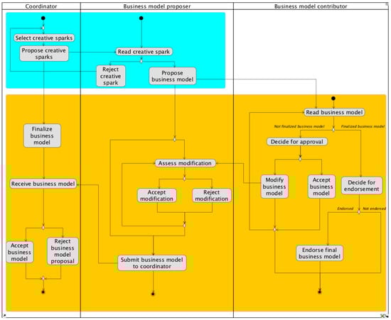According to the process depicted in Figure 6, the coordinator selects some creative sparks (Select creative sparks) and proposes them (Propose creative sparks) to the other members of the innovation team. Then, business model proposers read the above-mentioned proposals (Read creative spark) and either reject them (Reject creative spark) or accept them (Propose business model). It should be noted that in the last case the creative spark is promoted to the status of a business model. At this stage, business model contributors can collaborate in better defining the proposed business models. They read those already proposed (Read business model) and can decide (Decide for approval) to either modify (Modify business model) or accept (Accept business model) them. Then, business model proposers assess—if any—the requested changes (Assess modification) and decide either to accept (Accept modification) or reject (Reject modification) them. Then, if the coordinator has finalized the business model collection phase (Finalize business model), proposers can submit business models to her (Submit business model to coordinator) and contributors can decide (Decide for endorsement) to endorse them (Endorse final business model). Finally, the coordinator receives voted business models (Receive business model) and can decide to accept (Accept business model) or reject them (Reject business model proposals) according to their scores.