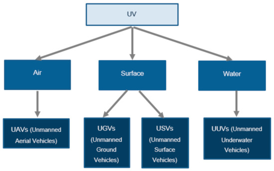 Unmanned vehicles (UVs) are used on all surface types (water, air, and land) [3,4]. The following illustration represents the classification of UVs, divided by action.