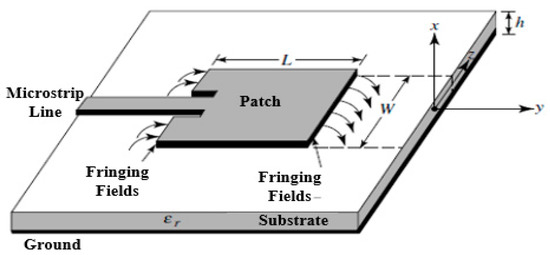 The main parameters that should be considered in this antenna project are: the relative dielectric constant of the substrate (εr); thickness h of the substrate and its size; patch configuration; and patch dimensions. These characteristics determine the radiation pattern of the antenna. Figure 3 shows a planar antenna with the above-mentioned characteristics.