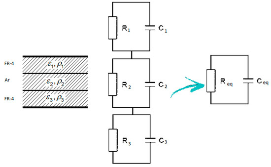 To perform the study of the tangent of losses, it was necessary to establish the equivalent circuit for the substrate, as shown in Figure 10. Each substrate corresponded to a parallel RC circuit, whereby the three underlying substrates corresponded to the series of these circuits as represented.