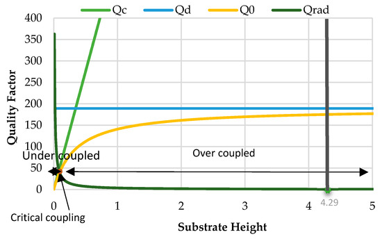 To study the coupling, it is necessary to consider the dielectric loss quality factor (Qc), antenna patch quality factor (Qd), metal loss quality factor (Qo), and the quality factor of antenna radiation (Qrad), represented by the following equations. Variables a, b, W, and L are represented in Figure 9 [17,18].