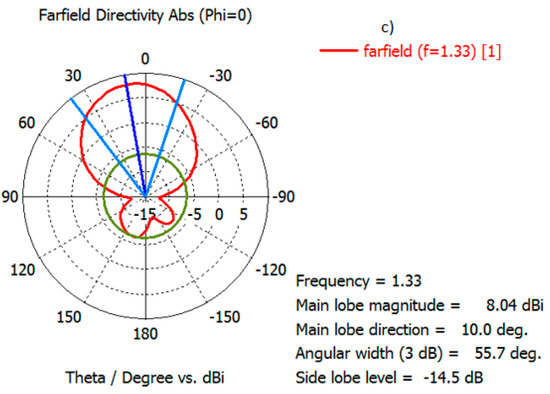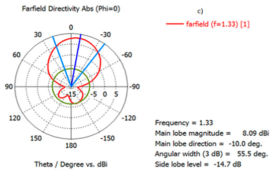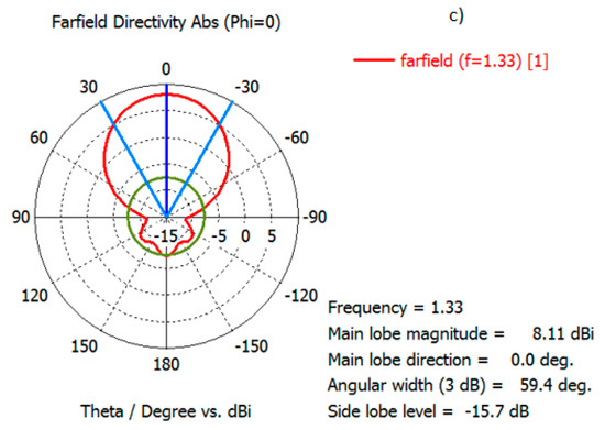 Starting with the analysis of the |S11| parameter, it was possible to verify that the resonance frequency was very close to the frequency in which antenna design was carried out, that is, the measured value was 1.41 GHz, and the antenna was dimensioned for 1.33 GHz. To correct this small deviation, it would be necessary to study the behavior of the resonance frequency with slight changes of distances 0 in the patch.