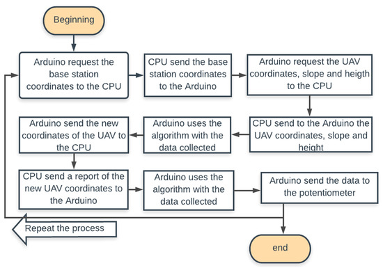 - the control system communicates with the central processor of the UAV, sending information about its orientation and positioning. According to the base station, the UAV must be perfectly perpendicular and parallel to the ground. It also sends information on changing the slope of the UAV;