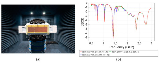 (a) Antenna in the anechoic chamber and (b) respective results of |S11| with a variation of 0 ± 5°.