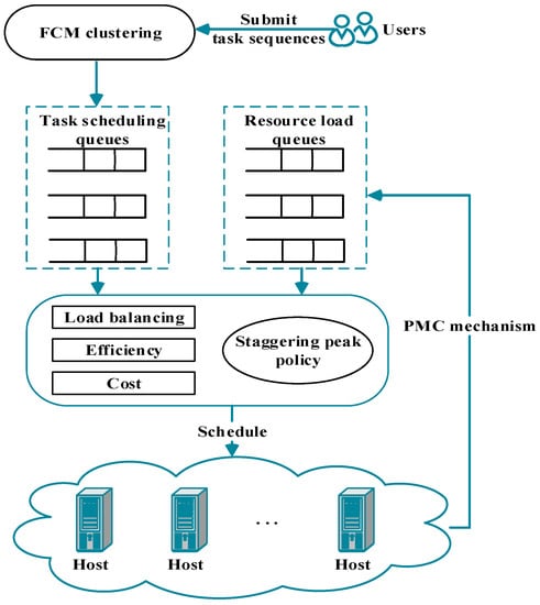 The system framework of SPSLAM proposed in this paper is shown in Figure 1. It includes three parts: task sequences classification, resources load sorting, and scheduling scheme generation. For the task sequences submitted by the user, firstly, based on the characteristics of each task and the different requirements of resources, the Fuzzy C-Means (FCM) clustering algorithm is used to divide the task sequences of the mixed workloads into multiple types of queues. Secondly, the classification and sorting of resources load is achieved by introducing the PMC mechanism. Finally, the task execution queues and resource sorting information are taken as input, and the final scheduling scheme is generated based on SPSLAM.