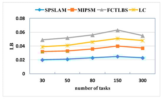 Figure 2 shows the performance of the four algorithms in load balancing by LB where the total number of tasks is different in all task sequences. The smaller the LB is, the more balanced the load between cloud resources gets. As is shown in Figure 2, as the number of tasks increases, the load of each VM resource also increases, causing the host to be overloaded and a decrease in LB. The LB of the SPSLAM algorithm has been relatively small and has little change, and the MIPSM algorithm is second. The FCTLBS algorithm performed the worst because it only statically clustered resources, and did not consider the dynamic nature of resources load, which led to imbalanced distribution of node load. The LC algorithm got better load balancing effect because it always prioritized the resources with lighter load during scheduling. However, when the number of tasks was too much, the effect became worse. The experimental results showed the advantages of the staggering peak scheduling policy based on task diversity and the dynamic nature of resources.