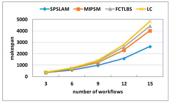 Figure 3 shows the scheduling completion time of the four algorithms in the case where the number of workflows is increased from 3 to 15. When the number of workflows is 3, the makespan of the four algorithms is not much different. With the increase of the number of workflows, the makespan of SPSLAM is significantly lower than FCTLBS, MIPSM, and LC. The reason was that SPSLAM staggered the resource usage peak and reduced the delay waiting time of the task when scheduling the workflow task sequences. In this way, it reduced the scheduling completion time and finally improved the task scheduling efficiency.