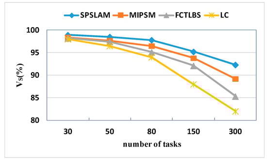Figure 4 shows the scheduling effect by . The abscissa is the total number of tasks in all task sequences, and the ordinate represents the success rate of different algorithms. As is shown in Figure 4, as the number of tasks increases, the resource competition occurs, and the of tasks decreases correspondingly. The LC algorithm did not consider task characteristics and its diversity when scheduling mixed workloads, and the performance was worse. The FCTLBS algorithm only pre-processed and statically clustered resources, which led to poor performance. The MIPSM algorithm only performed hard clustering on tasks, and did not consider the fuzziness of matching scheduling between task and resource, which had certain limitations. The SPSLAM algorithm had a task success rate of 90%, which was within an acceptable range. The experimental results showed that this policy had obvious advantages for mixed workloads.