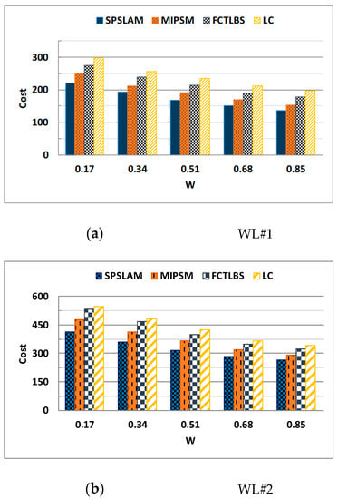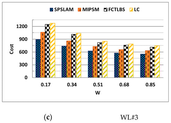 Figure 5 shows the scheduling cost of the four algorithms under different deadline constraints. The experiment was divided into three groups, and each group executed different test workloads (WL#1, WL#2, and WL#3). We selected the five values in the minimum and maximum completion time intervals as the deadline constraints, , where was the weight parameter, and As is shown in Figure 5, when the constraint on the deadline is reduced, the scheduling scheme that satisfies the time constraint is gradually increased and the cost of the four scheduling algorithms is reduced. Among the four algorithms, the resource usage cost generated by SPSLAM was the lowest. The reason was that the SPSLAM algorithm considered the characteristics of each task for mixed workloads and used the FCM algorithm to divide the task sequences into three categories according to the resources requirements such as CPU, memory, and I/O, which reduced the blindness of tasks scheduling. The resources were sorted by CPU size, memory, and I/O load size by monitoring the load status to narrow the resource selection range. SPSLAM considered the task characteristics and resources load status when scheduling multiple task sequences, which improved the task scheduling efficiency and reduced the resource usage cost.