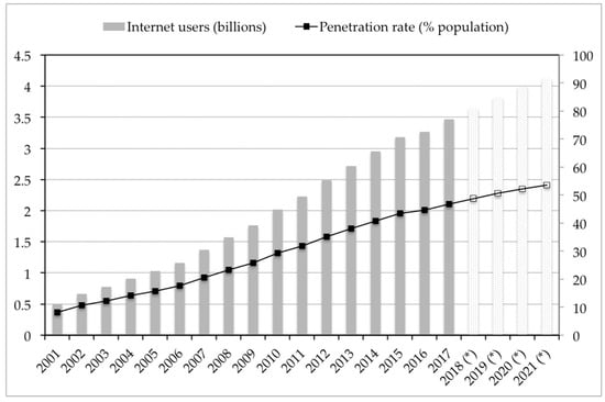 - Internet Users and Penetration Worldwide. 2016-2021—Emarketer. Available online: http://www.emarketer.com/Chart/Internet-Users-Penetration-Worldwide-2016-2021-billions-of-population-change/206259 (accessed on 14 December 2017).