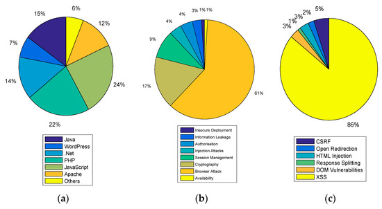 Analyzing the information shown in Figure 3 [42], JavaScript and PHP are the programming languages with the most vulnerabilities, generating a high amount of security weaknesses. Technologies and frameworks based on Java are less vulnerable; in cases of vulnerability, this is usually because of poor component or framework patching. Packages such as JQuery in PHP and JavaScript are also a source of vulnerabilities. Despite being the most used web-server software, Apache [43] can present several vulnerabilities due to poor configurations and patching policies. At the application layer, 61% of attacks are made through a web-browser. 86% of those web-browser attacks correspond to an XSS attack, thus constituting a vast majority. In an XSS attack, a mischievous user finds a means to insert a malicious code fragment into the website [16]. That is, an XSS attack injects a malicious sequence of commands into a trusted website executed on the visitor’s web-browser (without the visitor’s knowledge), and therefore, the attacker has access to sensitive user data, such as session tokens and cookies, stored in the browser [44]. Some variations of the XSS attack are the following: