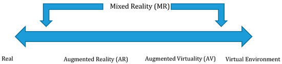 As it currently stands, the most commonly used definition of MR is presented by Milgram and Kishino [19], and is situated within the reality-virtuality continuum. This allows for the construction of different environments along the continuum from physical environments to virtual reality (VR) (see Figure 1). The continuum starts with the real physical environment on the left-hand side before moving through augmented reality (AR), where the real world is augmented by the virtual, and augmented virtuality (AV), where the virtual world is augmented by the real, to arrive at virtual reality or virtual environments on the right-hand side of the continuum.