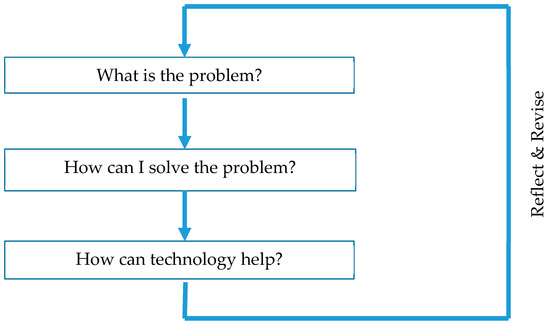 Looking to put ‘pedagogy before technology’, this model encourages educators to think about the pedagogical issue in their classroom first, then think about a solution to that problem (free of technology limitations), and finally look at how technology can help. Similar to the overarching DBR framework, this model is iterative and encourages returning to step 1 after testing has been carried out to refine and reflect. Figure 3 gives an overview of these steps.