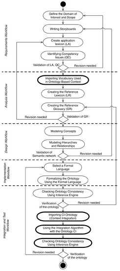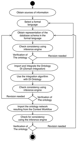 - Using the Integration Algorithm with CI Ontology: After the importation of the ontologies’ vocabularies, the designers must integrate these ontologies, generating a net of ontologies. This network of ontologies will be used in the next steps of the workflow.