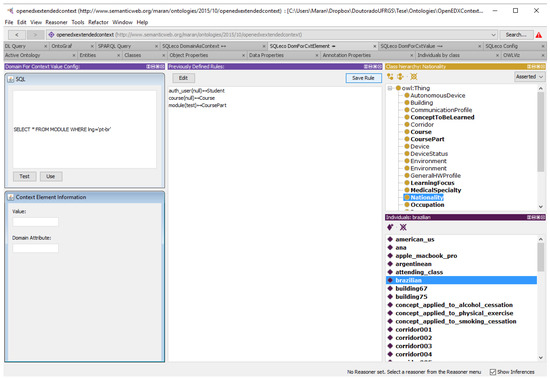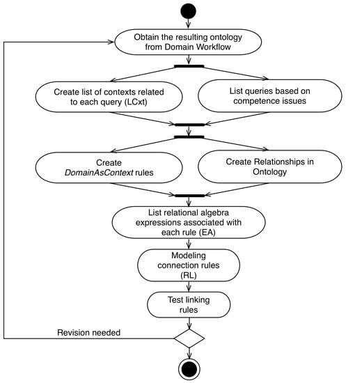 - Test linking rules: After the definition of the linking rules by the modeler, the set of defined rules and the network of ontologies generated in the process are serialized in a DB instance. In this step, the modeled rules are tested. In this testing step, rules are tested only in terms of syntax and semantics. These tests are done through contexts of interest, entered manually, and verification of the return of the queries by the domain expert.
