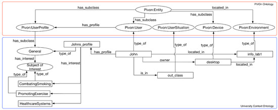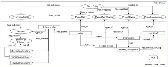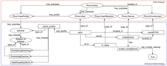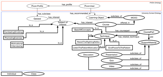 “A university uses an ubiquitous middleware to manage the educational resources present. This middlware uses an ontology as a context representation model. This ontology contains a set of axioms that, together with a set of processes managed by the middleware and allows data collected from the environment to be aggregated, and after inferences, considered as context information. Thus, the context management of interest in this ubiquitous middleware infers the situations in which students and teachers are. This university also has a recommendation system that presents warnings to students about educational resources that may be of interest. Therefore, the context of interest of each student and teacher is inferred and send to the recommendation system, which recommends to the student or teacher an interesting resource available at the university.A MOOC in the area of psychology and medicine is composed of cases of Motivational Interview (MI). Motivational Interview is a patient-centered approach to demonstrate behavioral changes to increase effectiveness in treating diseases such as obesity, smoking, and depression. The group of techniques that make up a MS has been constantly studied in a wide range of health-related behaviors [39]. To prepare the MOOC on motivational interview, the technical staff assembled the course with a structure composed of topics, where each topic consists of a supporting material (video, document or presentation) and a set of questions. If the student correctly answer the questions related to that topic, the progression to the next one is allowed and new motivational interview situations are introduced. The student completes the course when has finished all the tasks related to the basic concepts and has finished more than 50% of the exercises related to the specific motivational interview cases applied to different contexts (illness to be treated, motivation, among others).Johan is a student of the university’s collective health course who has the ubiquitous middleware and resource recommendation system. At the time of enrollment, Johan registered his smartphone in the system of the university and from there began to receive recommendations of resources. Johan lives in the city of Smartville. Currently, Johan attends the semester, and in a class of Applied Psychology to Health, the system of recommendation used by the university sends an alert to Johan in his smartphone recommending to enroll in the MOOC on Motivational Interviews. During the break of class, John visualizes the alert and enrolls in the Motivational Interview MOOC. At this point, the MOOC asks Johan for permission to receive context information managed by the university’s ubiquitous middleware. Johan authorizes and the MOOC begins to receive constant updates of contexts of interest.”