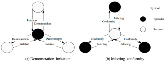 The spread of unsafe behaviors through demonstration–imitation refers to workers who receive unsafe behaviors practicing the same or similar unsafe behaviors through behavioral imitation, having learned based on the behaviors demonstrated by the propagator. This includes two parallel processes (Figure 1a): behavioral demonstration by propagators and behavioral imitation by receivers. In practice, mentoring and self-study imitation are the primary methods of acquiring occupational skills by construction workers, but a substantial amount of unsafe behaviors are closely related to the specific work and skills. Consequently, it can be considered that behavioral demonstration and imitation can also spread unsafe behaviors. As shown in Investigation 1, 77% of workers acquired skills through mentoring and 23% through self-study imitation.