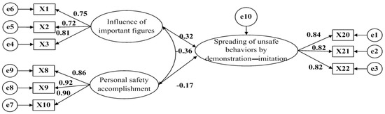 Factors impacting the spread of unsafe behaviors among construction workers consist mainly of internal and external factors, and the spreading mechanisms include demonstration–imitation and infecting–conformity. On the premise of not impacting the accuracy of research results, the authors established a fitting path for the internal and external factors and for demonstration–imitation and infecting–conformity types, respectively. Hence, four SEM models were constructed, as shown in Figure 2, Figure 3, Figure 4 and Figure 5.