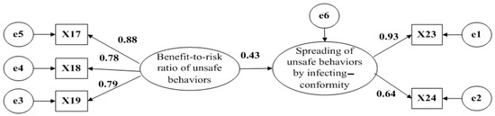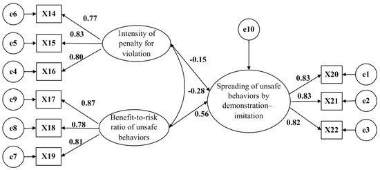 In Figure 5, χ2/df = 0.572, CFI = 1.000, TLI = 1.009, and RMSEA was close to 0; the path fitting was good, and the model was accepted. The standardized regression coefficient of the intensity of penalties for violations to the spreading of unsafe behaviors through infecting–conformity was 0.433, t = 6.024, and p < 0.05, verifying H6b.