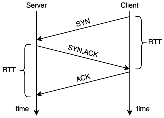 Measuring round-trip time (RTT) in a three-way handshake of the Transmission Control Protocol (TCP).