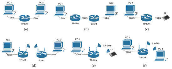 - Scenario 4: In this scenario, we connected both PCs with a WiFi link, as shown in Figure 2d. The TP-Link router acted as an access point (AP), while the dd-wrt acted only as a WiFi client that directly connected PC2 to PC1. In this scenario, we used the 2.4 GHz band with a 40 MHz channel with a 22 modulation and coding scheme (MCS) index in transmission and a 23 MCS index in reception, measured with iw.