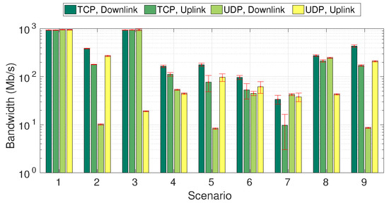 Specifically, iperf3 is one of the de facto standard tools to actively measure network KPIs. We note that iperf3 works differently depending on the selected transport protocol—see the discussion on BW measurements in Section 2. We recall that measurements on top of UDP provide an estimation of path capacity by sending packets at a configured rate. The implications of this method are twofold. First, this entails that the packet rate must be adjusted to a rate near the capacity of the path. Otherwise, BW estimations will suffer from the effect of high packet-loss ratios. Coherently, we estimated the maximum transmission rate of iperf3 such that packet losses were kept as close as possible to zero, before recording the measurements of a scenario. Second, estimations in the client side do not reflect the true capacity of the path, as the sending rate remains constant. Hence, only server side measurements could be used to characterize the network performance. Finally, another critical factor of UDP-based measurements is that the packet size must be adjusted to prevent fragmentation at the network layer; otherwise, the loss of a single fragment causes the loss of the whole UDP datagram, which degrades the estimated KPIs.