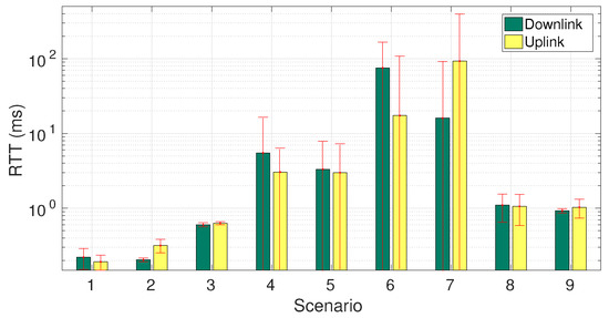 Measured round-trip time (RTT) in milliseconds. Bars show average results, with whiskers representing standard deviations.