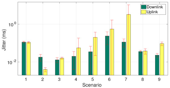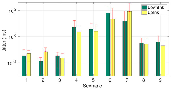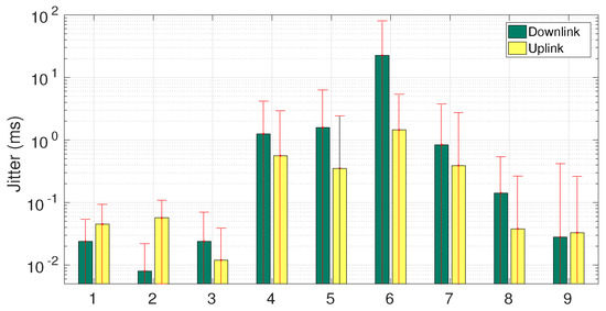 We had two jitter measurements. On the one hand, in Figure 5, we show the jitter reported by iperf3. On the other hand, in Figure 6 and Figure 7, we have computed the jitter using Equation (6) with the ping probe times.