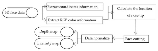 The 3D face pre-processing flow diagram is shown in Figure 1, and an example of 3D point cloud face data transformed into the depth image and the intensity image is shown in Figure 2.