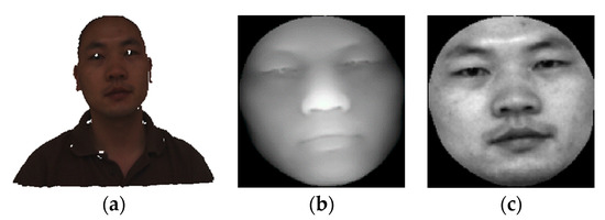 Figure 2. The bimodal maps obtained from 3D face point cloud model. (a) Example of 3D face data model in CASIA database; (b) example of the depth map; (c) example of the intensity map.