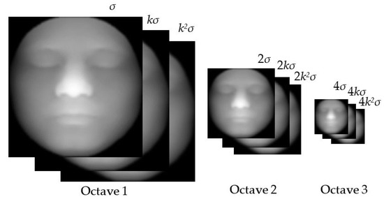 where W r , c is weight matrix of the multiscale space, the coefficient k c 1 controls the magnitude of σ , and the coefficient 2 r 1 controls the size of the image in different octaves, which means that size of the first octave of the image is 2 r 1 times that of the rth octave. The result of the weighted multiscale operation is shown in Figure 3; these nine images are generated after the operation, so there are three octaves produced, each with three images. In this paper, k = 21/3, σ = 1.6 (refer to Lowe’s literature [6]), ω 1 = 0.5, ω 2 = 0.3, and ω 3 = 0.2.