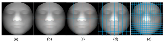 Figure 4. Sub-blocks’ operation: (a) The original depth map; (b) 2 × 2 sub-blocks image; (c) 4 × 4 sub-blocks image; (d) 8 × 8 sub-blocks image; (e) 16 × 16 sub-blocks image.