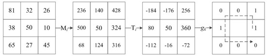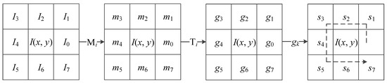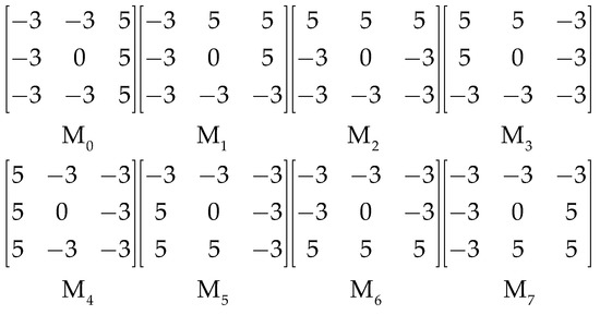 The local directional pattern [27] of each pixel is an eight-bit binary code calculated by comparing the edge response values (m0, …, m7) of different directions in a 3 × 3 neighborhood. The edge response values are obtained by convolving the 3 × 3 neighborhood with eight Kirsch masks. Kirsch masks M0 to M7 are shown in Figure 5. Then, the top k response values |mi| (i = 0, …, 7) are selected, and the corresponding directional bits are set to 1. The remaining (8 − k) bits are set to 0, and the binary expression of a local directional pattern is as follows: