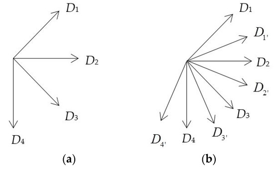 Figure 6. Directions of the gradients. (a) The four different directions of relative gradients in GBP; (b) The eight different directions of relative gradients in LGP.