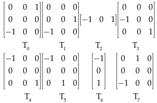 To calculate the relative gradients of each pixel in eight directions, four non-diagonal directions need to be added to enrich the four directions (D1, D2, D3, D4) used the GBP descriptor. We adopted four two-dimensional masks [0 0 0; 0 0 1; −1 0 0], [0 0 0; −1 0 0; 0 0 1], [−1 0 0; 0 0 0; 0 1 0] and [0 1 0; 0 0 0; −1 0 0] to calculate the four additional directions, i.e., D1′, D2′, D3′, and D4′, as shown in Figure 6b. Eight directional masks, T0 to T7, are shown in Figure 7.