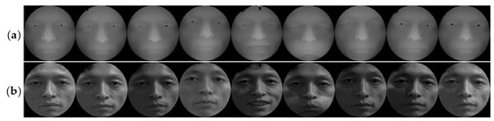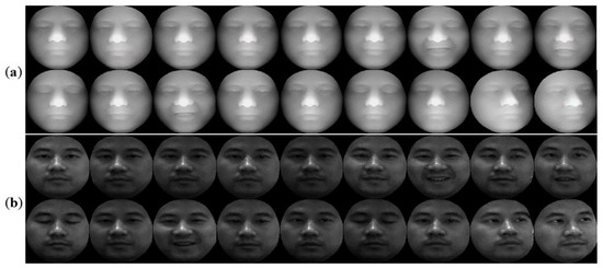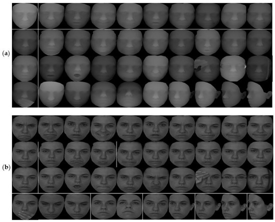 Each database has been experimenting with two groups of images. For the CASIA database, the first group includes 40 people selected, with 36 pictures randomly selected for each person. An example is shown in Figure 10. In Figure 10a,b, there are 18 samples of the depth and intensity maps, respectively, and these samples involve illumination, expressions, and pose variations. The second group is based on the previous increase of 40 people’s data. For the FRGC v2.0 database, the first group selected 80 people (18 pictures per person) in the database randomly, and an example is shown in Figure 11. In Figure 11a,b there are nine samples of the depth and intensity maps, respectively, and these samples involve illumination, expressions, and age variations. The second group is based on the previous increase of 80 people’s data. For the Bosphorus database, the first group includes 40 people selected, with 80 pictures per person, and an example is shown in Figure 12. In Figure 12a,b, there are 40 samples of the depth and intensity maps, and these samples involve expressions, occlusion (eye occlusion, mouth occlusion, eyeglasses occlusion, and hair occlusion), and pose variations (yaw 10, 20, 30, 45 degrees). The second group is based on the previous increase of 40 people’s data.