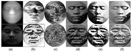 Figure 13. Maps of the five descriptors: local binary pattern (LBP), local directional pattern (LDP), gradient binary pattern (GBP), LGP and weighted histogram of gradient orientation (WHGO). (a) The original depth map and intensity map; (b) corresponding LBP maps; (c) corresponding LDP maps; (d) corresponding GBP maps; (e) corresponding LGP maps; (f) corresponding WHGO maps.