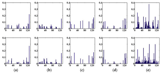 Figure 14. Comparison of the LGP, WHGO, and three other descriptors: (a) the results of the LBP descriptor; (b) the results of the LDP descriptor; (c) the results of the GBP descriptor; (d) the results of the LGP descriptor; (e) the results of the WHGO descriptor. Abscissa: gradient orientation after being quantized; Ordinate: weighted frequency value.