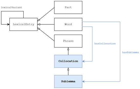 A new property, ditmao:hasSublemma, has been defined as a sub-property of lemon:LexicalVariant, holding between word and sublemma (e.g., hasSublemma ). Similarly, a property ditmao:hasCollocation has been defined as a sibling sub-property, holding between Word and Collocation (e.g., hasCollocation ).