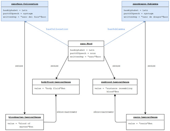 Another aspect not discussed in [25] is that the sublemma relation is essentially two-fold. On the one hand it is formal, in the sense that the head noun of the multiword expression determines its lemma, and on the other hand, it expresses a semantic relation between the lemma and sublemma, mostly a hypernym-hyponym relation. In about 80% of the multiword expressions, both criteria coincide. These terms are formally and semantically endocentric. For example, , meaning ‘fever’ has the sublemmata , and , which designate certain subtypes of fever. However there are cases where the head noun of the multiword expression and its lemma are not directly related semantically. For example, , which is literally translated as ‘blood of dragon’, is not, in our texts, a kind of blood, but a (red) resin derived from various plants of the Liliaceae family (Dracaena draco Willd. or Dracaena draco L.). The literal, compositional meaning of the compound is nevertheless available (Similar cases are the terms with the literal meaning ‘head of monk’ and a second meaning designating a plant, Taraxacum officinale F.H. Wigg., and with the literal meaning ‘tongue of cow’ and a second meaning designating a plant Anchusa officinalis L.). As the term is the head of the compound and the prepositional phrase ( ) is its modifier, it will be the corresponding lemma. In order to capture the fact that and are related metaphorically, we decided to introduce a metaphorical lexical sense for . This sense states something like ‘a substances that resembles blood in, e.g., color and consistency’. Doing so, the semantic relation between a sublemma and the lemma may be maintained as a hypernym-hyponym relation (for example, by means of the skos:narrower relation). The representation of the formal and semantic aspects of the sublemma relation and the collocation relation in lemon is given in Figure 2.