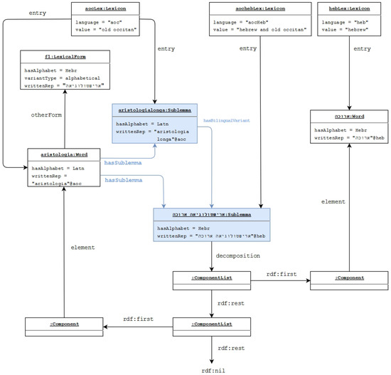 /’RWKH, meaning ‘long’, which is a Hebrew translation of the Old Occitan adjective . However, this term is not isolated. The texts contain also the complete Old Occitan forms, here aristologia longa, both in Latin and in Hebrew script. In [25], we argued that these terms should be classified as belonging to the Hebrew lexicon, because the terms mostly occur in Hebrew prose texts or in Hebrew translations. This is taken as an indication that the mixed term was part of the technical vocabulary used by Jewish physicians living in Southern France and the Hebrew, and Old Occitan part was most likely transparent for these physicians. Shortcomings of this solution are: (i) the vocabulary of Jewish physicians living in Southern France should not be equated to the Hebrew lexicon; (ii) the Old Occitan part should not be part of the Hebrew lexicon. These terms thus do not belong to either of the two languages, but the lemon model requires the language to be unique for a lexicon. The solution we propose is to introduce a bilingual lexicon, here an Old Occitan-Hebrew lexicon, but only for mixed terms that are not incorporated in one of the languages. As shown in Figure 3 below,