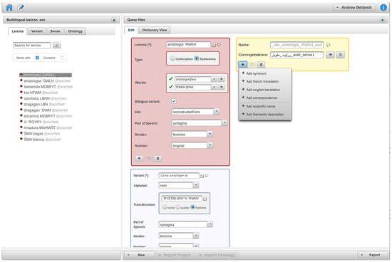 If the resource is multilingual, lemmas, forms and senses can be filtered by language. The information related to the selected entry is shown in the central panel where the lemma (red box) appears in the upper part of the leftmost column on top of the relative forms (blue boxes). On the right, the lexical senses are shown (yellow boxes). A user can add both lexico-semantic relations between senses (such as synonymy and translation) and associative relations between lemmas (e.g., sublemma and collocation). For example, Figure 4 shows the details of the multi-lexicon phrase aristologia ’RWKH (aristologia longa).